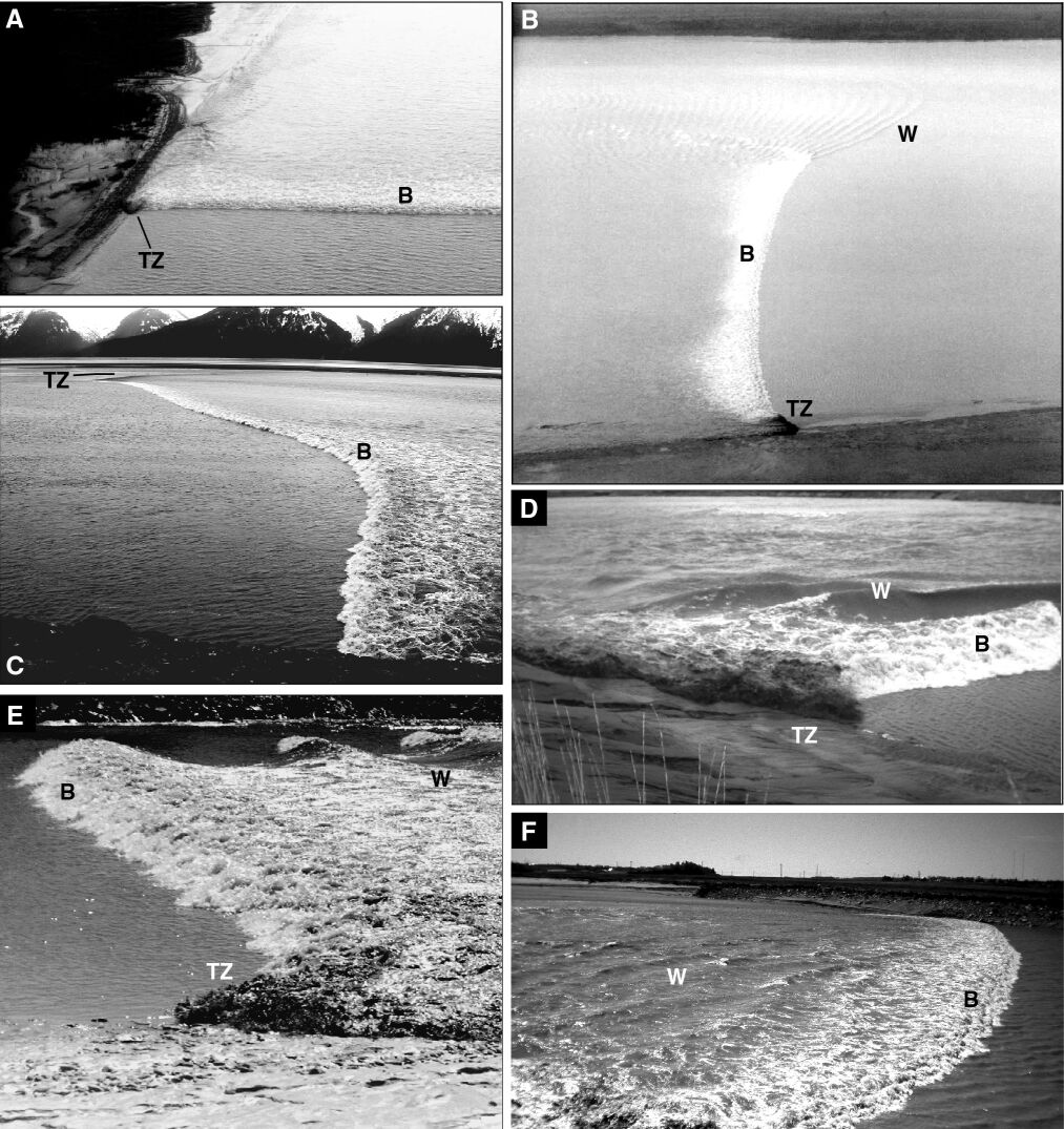 Photos of tidal bores: (A-B) Araguari river, Amapa, Brazil; (C) Turnagain Arm, Cook Inlet, Alaska, USA; (D-F) Salmon river estuary, Bay of Fundy, Canada (TZ= turbid zone; B = bore, W = water) (Photos courtesy of Allen Archer, 2002).